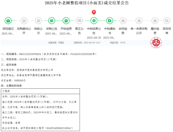 2025年小老树整治项目(小而美),中标价1680000元,工作内容是对中江大道、长江南路、北京中路、峨山东路等道路上的小老树进行更换,计划工期60日历天。
