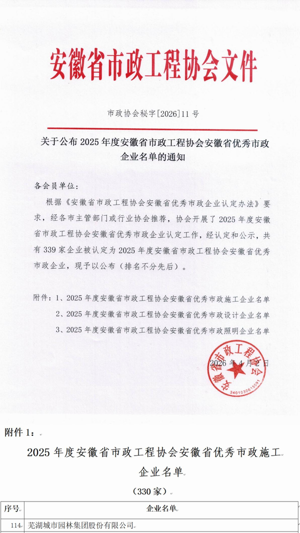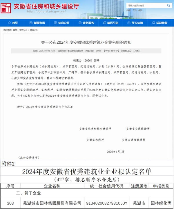 园林集团入选安徽省住房和城乡建设厅公布的“2024年度安徽省优秀建筑业企业(园林绿化类)”名单。同日,集团凭借景观工程建设和绿化养护的扎实工作及多项重点工程的优异履约表现,在省市政工程协会评优中获评“2025年度安徽省优秀市政施工企业”。多次获奖,是行业对集团在“建”与“养”两端协同发展的客观认可。