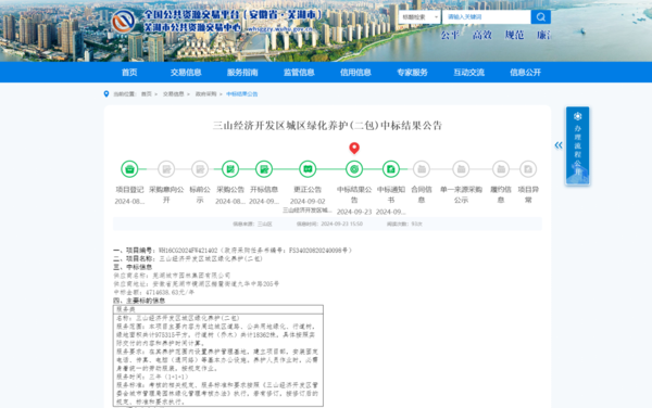 继九月初中标湾址区2024 年-2027 年芜湖市湾沚区东湖公园和津绿廊永平园等公园及空港产业园研发基地物业管理项目(二包)后,9月23日,园林集团又成功中标三山经济开发区城区绿化养护(二包)项目,该项目中标价约471万/年,3年合同总金额为1414万元。