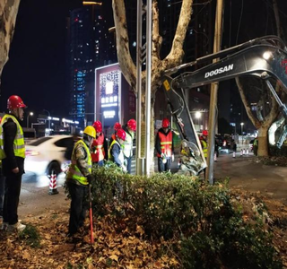 园林集团党委自接到移植任务起,一是多次到项目现场调研,与相关单位反复论证,结合长江路法梧保护、交通通行、管线保护、周边建筑和居民正常生活保障等多种因素,不断优化移植方案。二是选派优秀党员和业务骨干为移植施工现场责任管理人员,明确工作任务,克服起挖管线复杂、施工面小、冠幅回缩难度大的困难,集中力量、创造施工条件,攻坚克难。本次集中移植行动现场总计安排高空作业车3台,挖机11台,吊车10台,随车吊15台、货车13辆,投入党员、职工200人次,最终顺利完成移植,保障了长江路下穿工程项目建设进度。