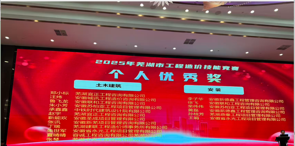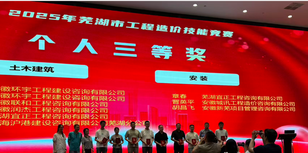 2025年9月19日,备受业界关注的2025年芜湖市工程造价技能竞赛决赛圆满落幕。安徽城讯工程造价咨询选派的晋英平、汪炜同志凭借扎实的专业功底、精湛的实操技能从参加决赛的89人脱颖而出,荣获奖项,其中晋英平同志获得安装个人三等奖、汪炜同志获得土木建筑个人优秀奖,充分展现了安徽城讯公司同志们的过硬本领。