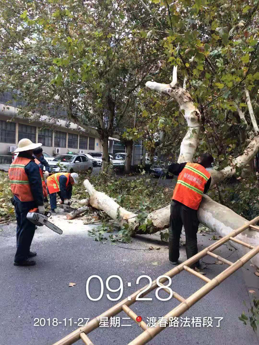 11月27日上午8时40分,渡春路上一棵有着多年历史的高大法梧突然倾倒。上午9时左右接到110报警平台电话,我们 当时即组织20多位施工人员并调配3辆抢险车及时赶到出事现场。倒下的法梧树已完全占据了机动车道,幸运的是没有砸到任何人员和车辆。为减少对路面的阻挡,我们先锯断倒在机动车道上的法梧树的枝干、树桩,然后依次装到抢险车上运走。镜湖交警大队八中队的交警们维持秩序,引导车辆从道路南侧绕行。经过半小时抢险,道路已经畅通了。